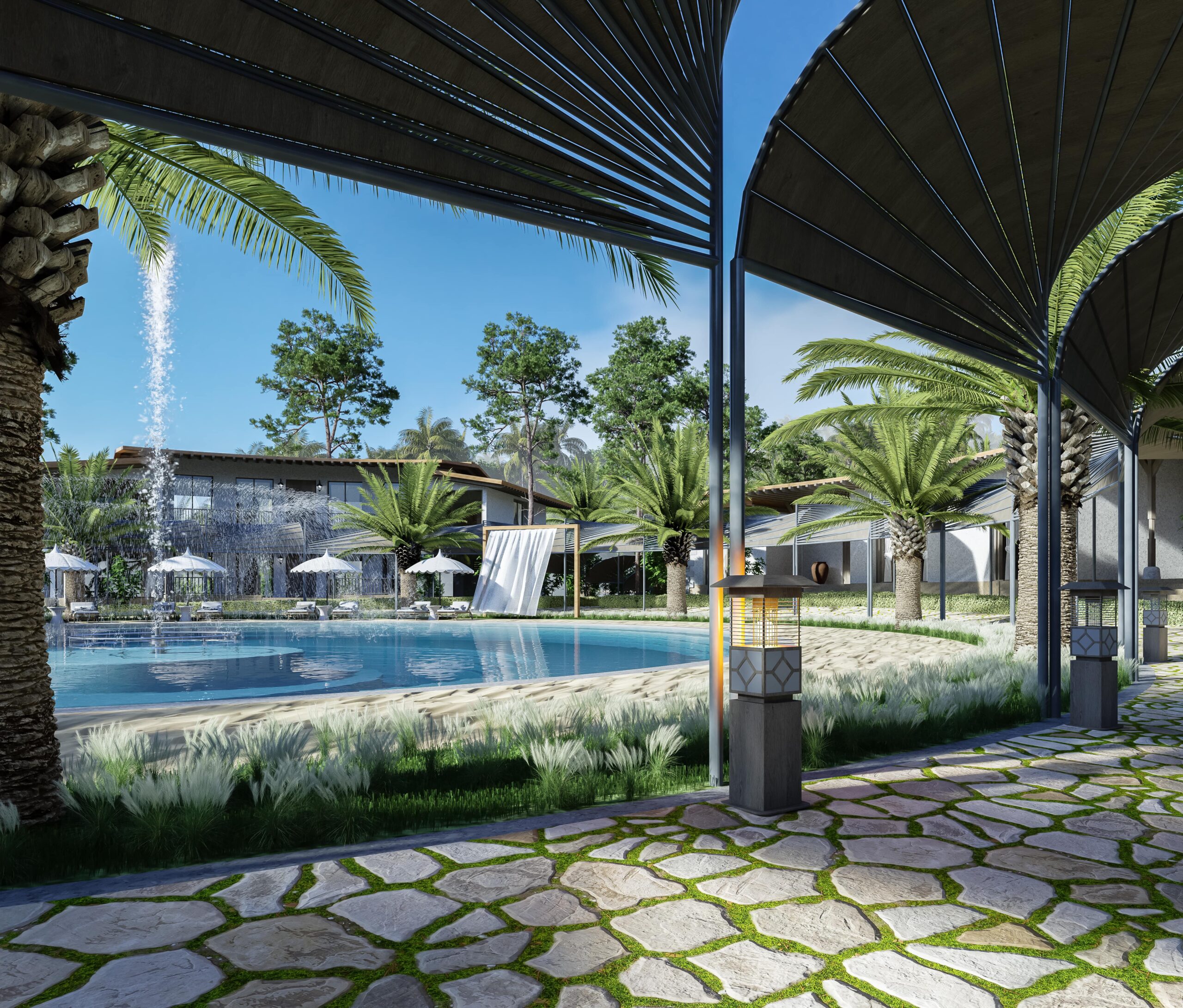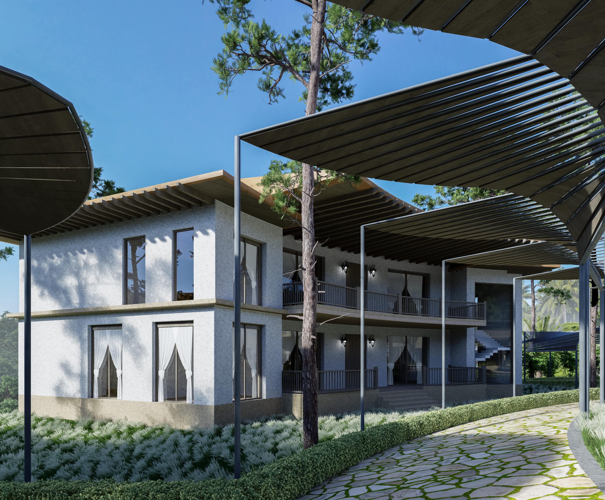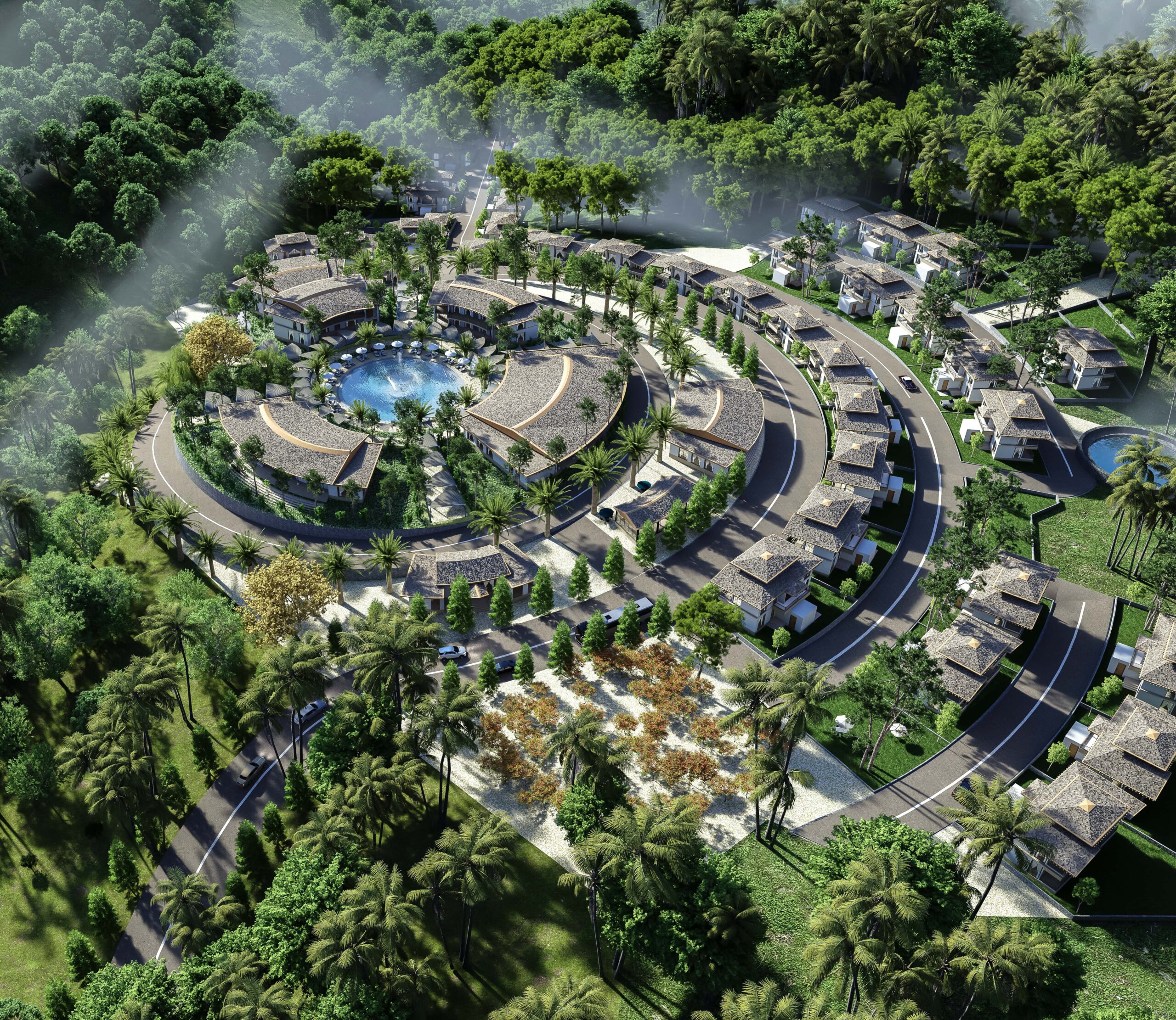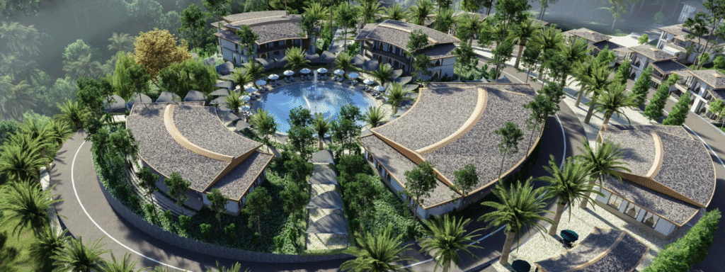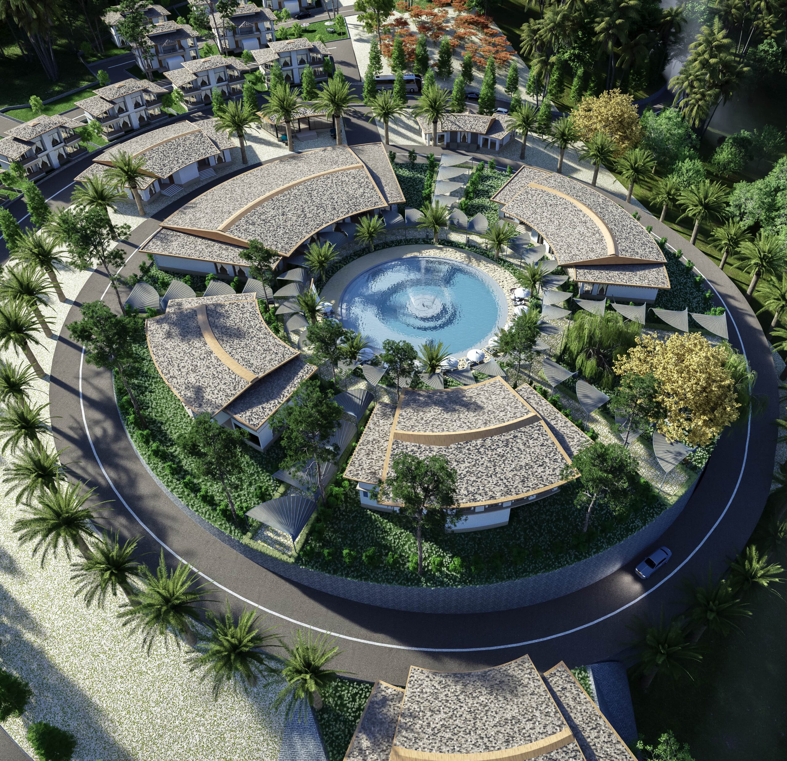Kokan Vaibhav Resort is a 16-acre master-planned retreat drawing from the timeless elegance of Balinese architecture while responding sensitively to the lush valleys of Mandangad. The layout is organically zoned with clusters of G+1 villas built on 2000 sq.ft. NA plots, arranged to maximize privacy, cross-ventilation, and valley views. The villas feature pitched roofs with extended eaves, reflecting tropical resilience and echoing the sloping contours of the landscape. Natural materials like locally sourced laterite stone, exposed timber beams, and terracotta tiles establish a strong regional character, while large overhangs, open-to-sky courtyards, and wraparound verandahs ensure thermal comfort and seamless indoor-outdoor transition. At the heart of the resort lies a grand circular pool and water plaza, inspired by Balinese temple ponds and the Kokan coast’s fluidity, creating a serene axis that anchors communal and leisure spaces. The spatial language throughout the resort prioritizes low-density, breathable planning, verdant buffers, and meandering pathways — forming a harmonious blend of architecture, nature, and cultural symbolism.